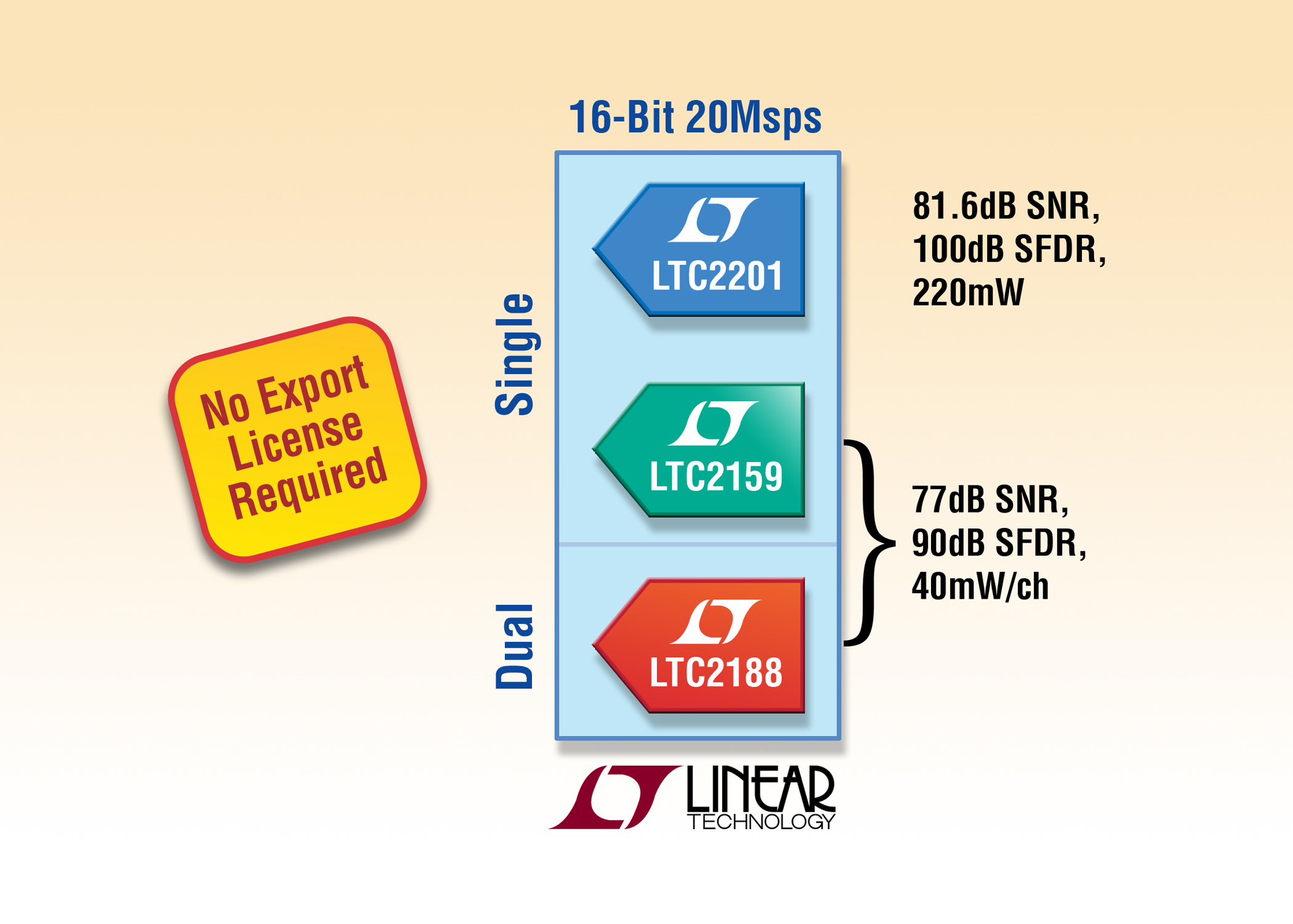 近日,凌力爾特公司 (Linear Technology Corporation) 非常高興地宣布三款新的 16 位 20Msps ADC 擁有出口管制分類號(hào) (ECCN) 3A991,因此這些器件無需美國(guó)的出口許可證,就可向中國(guó)、俄羅斯以及其他有關(guān)國(guó)家供貨。