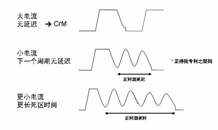 具體講,CCFF架構(gòu)具有固定導(dǎo)通時(shí)間控制和頻率反走特性。在大電流時(shí),電路以臨界導(dǎo)電模式工作。小電流時(shí)(重負(fù)載時(shí)接近線路過(guò)零點(diǎn),輕載時(shí)位于全部正弦方波),因此,磁芯復(fù)位后下一個(gè)周期并不會(huì)立即啟動(dòng);相反,定時(shí)器開(kāi)始調(diào)節(jié)死區(qū)時(shí)間;電流越小,定時(shí)器持續(xù)時(shí)間(死區(qū)時(shí)間)越長(zhǎng);定時(shí)器持續(xù)時(shí)間取決于大小;定時(shí)器僅控制死區(qū)時(shí)間(不控制開(kāi)關(guān)周期/關(guān)閉時(shí)間)。由于死區(qū)時(shí)間不受電流周期時(shí)長(zhǎng)變化的影響,因此可以毫不猶豫地進(jìn)行谷底導(dǎo)通。