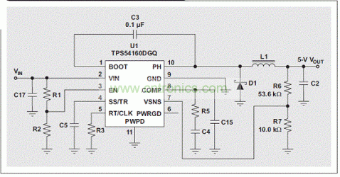 為了說明使用高開關頻率的權衡過程,我們設計了三個獨立電源,其工作頻率分別為100、300和750 kHz。所有這三種設計,輸入電壓均為48V,輸出電壓均為5V,而輸出電流均為1A。這些要求常用于為一個5-V邏輯USB,或者為其它DC/DC轉換器使用的中頻通用5-V總線供電,例如:低壓降穩(wěn)壓器等。若想建立一些設計限制,所選允許紋波電壓需為50mV,其約為輸出電壓的1%;同時選擇使用0.5 A的峰至峰電感電流。德州儀器TPS54160是一種集成MOSFET的2.5-MHz、60-V、1.5-A降壓DC/DC轉換器,用作所有設計的穩(wěn)壓器。TPS54160特有外部補償和快速可編程頻率,適用于一些高輸入電壓的工業(yè)應用。