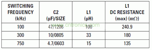 本例中,我們可以通過750-kHz開關頻率來產(chǎn)生一個5-V輸出電壓(參見表2)。但是,如果該頻率為1 MHz,則最低可能輸出電壓被限制為約6V;否則,DC/DC轉換器會跳過脈沖。替代方法是降低輸入電壓或者頻率。在選擇某個開關頻率以前,你最好是先查看DC/DC轉換器數(shù)據(jù)表,了解保證最小可控“導通”時間。