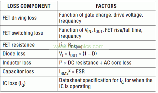 DC/DC轉換器的效率,是進行電源設計時需要考慮的最重要屬性之一。低效率會轉換成高功耗,必須要在印刷電路板(PCB)上使用單獨的散熱器或者更多的銅,才能處理這些功耗。功耗也對電源上游器件提出了更高的要求。如表3所示,功耗共有幾個組成部分。