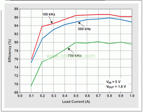 三個例子的重要損耗組成部分,來自于FET驅動損耗、FET開關損耗和電感損耗。FET電阻和IC損耗是一致的,因為所有三個設計中都使用了相同的IC。由于所有例子中都選擇了低ESR的陶瓷電容,因此電容損耗可以忽略不計。為了表明高頻開關的影響,我們對每個例子的效率都進行了測量,并將其顯示在圖2中。該圖清楚地表明,效率隨開關頻率增加而下降。若想提高所有頻率下的效率,需要尋找到一種全負載狀態(tài)下低漏到源“導通”電阻、低門電荷或者低靜態(tài)電流規(guī)范的DC/DC轉換器;或者尋找到一些具有更低等效電阻的電容和電感。