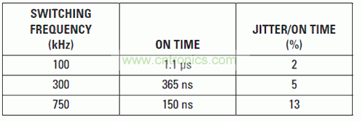 高轉換比和更高頻率時,會存在噪聲問題。當選擇某個高開關頻率時,設計人員應考慮抖動和DC/DC轉換器的最小“導通”時間。當占空比較小時,抖動噪聲便為開關脈沖的更大百分比。表6顯示了48-V到5-V轉換比時,抖動與“導通”時間之比。我們假設,在該相位節(jié)點上存在0.5-V二極管壓降和20-ns抖動。