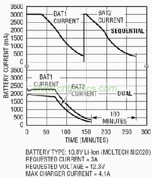 傳統(tǒng)上,雙電池系統(tǒng)是順序放電系統(tǒng),允許順序消耗電池電量(先消耗電池1,再消耗電池2),以簡單地延長總的電池工作時間。LTC1760采用了專有模擬控制技術,可允許安全地對兩個電池并行充電或放電。圖1是一個采用LTC1760的雙電池系統(tǒng)的簡化原理圖。這種結(jié)構使充電速度提高了50%,電池工作時間延長了10%。此外,并行放電不僅增強了電流能力,而且還降低了I2R損耗并改善了在極高負載條件下的電壓調(diào)節(jié)能力。降低I2R損耗和改善電壓調(diào)節(jié)都延長了時序解決方案的總放電時間(見圖2)。