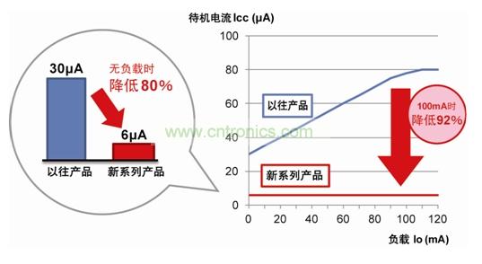 與以往產(chǎn)品相比,待機(jī)電流降低80%。而且,即使負(fù)載電流增加,新系列產(chǎn)品亦可維持6μA的待機(jī)電流,因此在負(fù)載100mA時(shí),待機(jī)電流可降低92%。