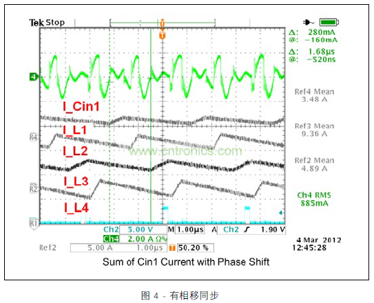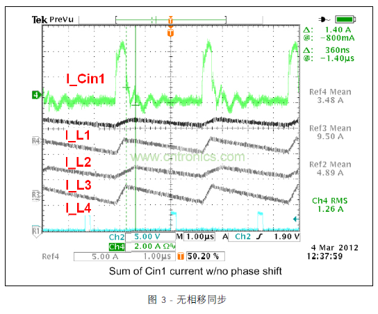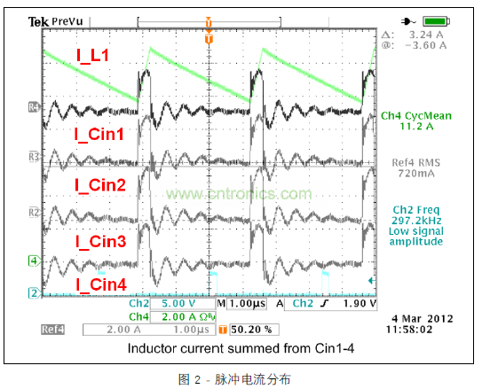 圖 3 顯示的范圍圖片涵蓋所有四個(gè)開關(guān)階段中的電感器電流與去耦合通道 1 的輸入電容器的脈沖電流。