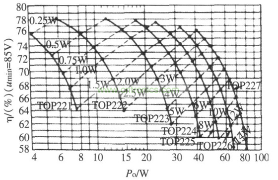 寬范圍輸入的交流電壓為85~ 265 V, 在這種條件下,TOP221~ TOP227 系列單片開關(guān)電源的P D,η,Po 關(guān)系曲線如下,見圖3、圖4。