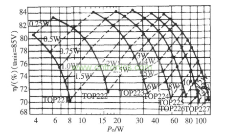 例如,設(shè)計(jì)輸出5 V, 30 W 的通用開關(guān)電源時(shí),就要選擇圖3.因?yàn)橥ㄓ瞄_關(guān)電源輸入交流電壓范圍85~ 265 V.首先從橫坐標(biāo)上找到Po = 30 W 的輸出功率點(diǎn),然后垂直上移,與T OP224 的實(shí)線相交于一點(diǎn),由縱坐標(biāo)上查出該點(diǎn)的η= 71.2%,最后從經(jīng)過(guò)這點(diǎn)的那條等值線上,查得PD = 2.5 W.這表明,選擇TOP224 就能輸出30 W 功率,并且預(yù)期的電源效率為71.2%,芯片功耗為2.5 W.如果覺(jué)得指標(biāo)效率偏低,還可以繼續(xù)往上查TOP225 的實(shí)線。同理,選擇TOP225 也能輸出30 W 的功率,而預(yù)期的電源效率可以提高到75%,芯片功耗可以降低1.7 W.然后根據(jù)所得到的PD 值,還可以進(jìn)而完成散熱片設(shè)計(jì)。