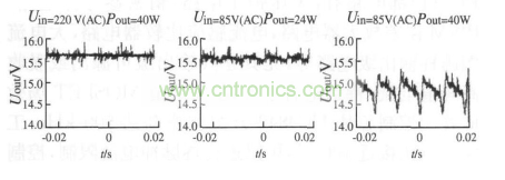 圖7分別給出了輸入電壓220 V ( 交流),輸出功率為40 W; 輸入電壓85 V ( 交流),輸出功率為24 W和輸入電壓85 V( 交流),輸出功率為40 W 時(shí)的輸出電壓波形。