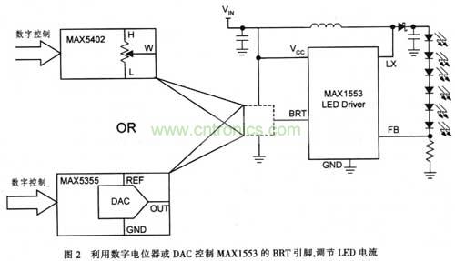 但在當前的許多應用中,DAC與數字電位器之間選擇的界限比較模糊,圖2中的DAC和數字電位器都可用于控制MAXl553 LED驅動器。MAXll53亮度(BRT)輸入的直流電壓和檢流電阻決定了LED的電流。