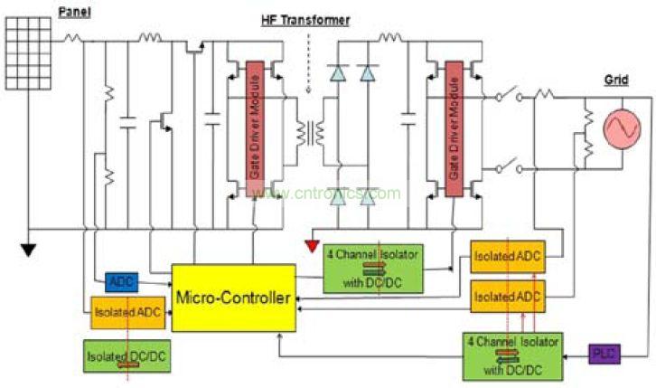 傳統(tǒng)上,隔離是由光耦合器實(shí)現(xiàn)的。然而,光耦合器的電流傳輸功能會(huì)隨著時(shí)間而下降,可能幾年后就無(wú)法運(yùn)行,遠(yuǎn)遠(yuǎn)低于許多太陽(yáng)能電池板提供的20年壽命擔(dān)保。這里,我們建議使用基于微變壓器的信號(hào)和電源隔離法,這種方法可以滿足PV逆變器中存在的多種集成需求。這種方法不但可以克服光耦合器的性能下降缺陷,而且允許集成ADC之類的檢測(cè)功能或者RS-485或RS-232收發(fā)器之類的接口功能。另外,該方法可以提供隔離電源用以驅(qū)動(dòng)這些檢測(cè)IC、隔離收發(fā)器或者隔離柵極驅(qū)動(dòng)器。基于光耦合器的柵極驅(qū)動(dòng)器則耗電量大,時(shí)序特性也非常不穩(wěn)定。基于微變壓器的柵極驅(qū)動(dòng)器不但功耗更低,而且可以具有匹配性更好的柵極驅(qū)動(dòng)器時(shí)序特性,可以顯著提高系統(tǒng)的總功率轉(zhuǎn)換效率。隔離的信號(hào)和電源集成也可大幅減少元件數(shù)量,從而降低系統(tǒng)成本、提高可靠性。