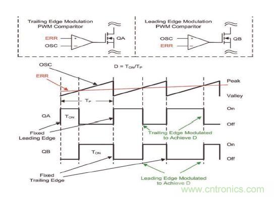 前沿調(diào)制脈寬調(diào)制稍微不同于后沿調(diào)制。OSC信號饋送至非反相脈寬調(diào)制比較器輸入,而誤差電壓則饋送給反相引腳。FET (QB) 關閉與OSC峰值電壓和前沿同步,當FET導通時對前沿進行調(diào)制以達到占空比(請參見圖 2)。