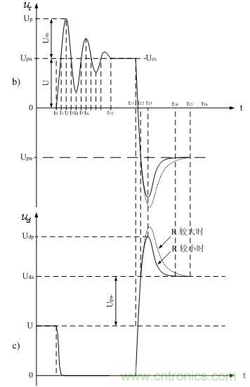 到t4時刻之后,輸入電壓ui對分布電感Ls和分布電容Cs進(jìn)行充電的過程,以及分布電感Ls和分布電容Cs互相進(jìn)行充電的過程,與t0~t4時刻基本相同。但由于在此期間,輸入電壓的上升率等于0,輸入電壓不再向分布電感Ls和分布電容Cs提供能量,因此,分布電感Ls與分布電容Cs產(chǎn)生自由振蕩的幅度是隨著時間衰減的,其衰減速率與等效電阻大小有關(guān)。