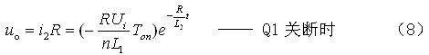 (8)式中,L1、L2分別為開關(guān)變壓器初、次級線圈的電感,n為開關(guān)變壓器線圈的匝數(shù)比,n=N2/N1,Ui為變壓器初級線圈的輸入電壓,Ton為開關(guān)管的導(dǎo)通時間,R為等效負(fù)載電阻。