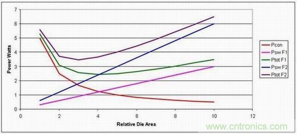 但是,在更高的工作頻率下,最佳裸片面積較小,從而帶來成本節(jié)約。實(shí)際上,在低頻率下,通過調(diào)整裸片面積來最小化損耗會(huì)帶來極高成本的設(shè)計(jì)。但是,轉(zhuǎn)到更高工作頻率后,我們就可以優(yōu)化裸片面積來降低損耗,從而縮小電源的半導(dǎo)體體積。這樣做的缺點(diǎn)是,如果我們不改進(jìn)半導(dǎo)體技術(shù),那么電源效率將會(huì)降低。