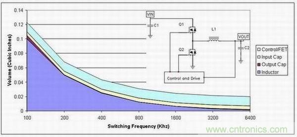 圖1顯示的是降壓電源頻率與體積的關(guān)系。頻率為100 kHz時(shí),電感占據(jù)了電源體積的大部分(深藍(lán)色區(qū)域)。如果我們假設(shè)電感體積與其能量相關(guān),那么其體積縮小將與頻率成正比例關(guān)系。由于某種頻率下電感的磁芯損耗會(huì)極大增高并限制尺寸的進(jìn)一步縮小,因此在此情況下上述假設(shè)就不容樂觀了。如果該設(shè)計(jì)使用陶瓷電容,那么輸出電容體積(褐色區(qū)域)便會(huì)隨頻率縮小,即所需電容降低。另一方面,之所以通常會(huì)選用輸入電容,是因?yàn)槠渚哂屑y波電流額定值。該額定值不會(huì)隨頻率而明顯變化,因此其體積(黃色區(qū)域)往往可以保持恒定。另外,電源的半導(dǎo)體部分不會(huì)隨頻率而變化。這樣,由于低頻開關(guān),無源器件會(huì)占據(jù)電源體積的大部分。當(dāng)我們轉(zhuǎn)到高工作頻率時(shí),半導(dǎo)體(即半導(dǎo)體體積,淡藍(lán)色區(qū)域)開始占據(jù)較大的空間比例。