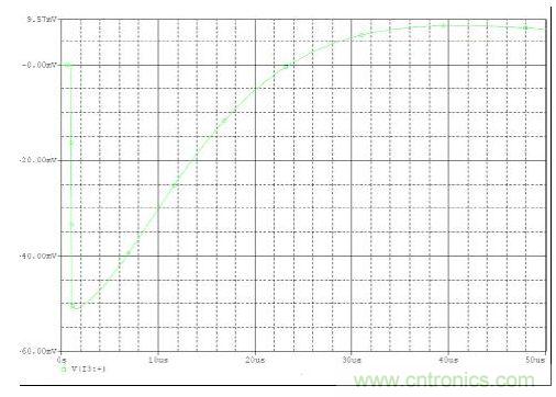 下面是一個如何使用上述關(guān)系的示例。問題是根據(jù)200kHz開關(guān)電源10 amp變化幅度允許范圍內(nèi)的50mV輸出變化挑選一個輸出電容。所允許的峰值輸 出阻抗為:Zout=50 mV / 10 amps 或5毫歐。這就是最大允許輸出電容ESR。接下來就是建立所需的電容。幸運的是,ESR和電容均為正交型,可單獨處理。一 個高 (Aggressive) 電源控制環(huán)路帶寬可以是開關(guān)頻率的1/6或30kHz。于是在 30 kHz 時輸出濾波電容就需要一個不到5毫歐的電抗,或高于1000uF的電容。 圖2顯示了在5毫歐ESR、1000uF電容以及30 kHz電壓模式控制條件時這一問題的負(fù)載瞬態(tài)仿真。就校驗這一方法是否有效的10amp負(fù)載變動幅度而言, 輸出電壓變化大約為52mV。
