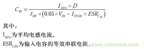 注意,輸入電流在反相降壓/升壓拓撲結構中也是非連續(xù)的。假設在接通時輸入電容的能量損耗所引起的輸入電壓偏差小于輸入電壓的5%,則通過下式可計算滿足此要求的最小輸入電容。