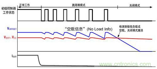 圖1是進(jìn)入關(guān)閉模式的過程。當(dāng)輸出電流從滿載慢慢降低時,初級控制器會從正常工作轉(zhuǎn)換成跳周期工作,輸出電壓和空載信息基本上比較接近;當(dāng)輸入極低跳周期或關(guān)閉模式時,輸出空載電壓將低于輸出電壓,從而檢測到極低負(fù)載或空載,激活關(guān)閉模式。