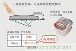 在靈敏度方面,通過獨創(chuàng)的高速采樣,使該產(chǎn)品在厚達15mm的覆蓋層中亦可使用。這使以往很難實現(xiàn)的在有一定厚度的圓形面板和曲面面板中應(yīng)用觸控開關(guān)成為可能。
