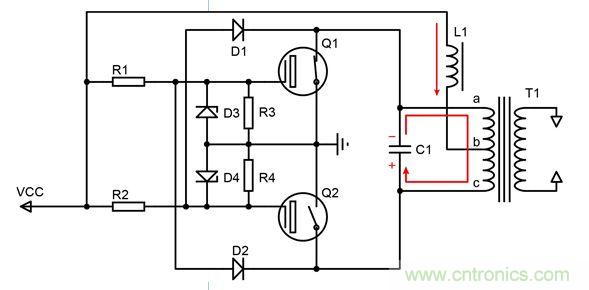 7. (圖3)由于T1對C1的持續(xù)充電,C1上電壓為a正c負(fù),通過兩個二極管使Q2柵極電壓升高,Q1柵極逐漸下降,同時正反饋形成,Q2導(dǎo)通,Q1截止。