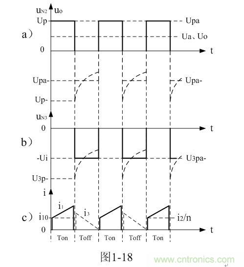 圖1-18-c)是流過(guò)變壓器初級(jí)線圈N1和次級(jí)線圈N3的電流波形,其中,實(shí)線部分是流過(guò)變壓器初級(jí)線圈N1的電流波形,虛線部分是流過(guò)變壓器次級(jí)線圈N3的電流波形。