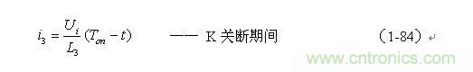 根據(jù)圖1-17,加到開關(guān)器件(控制開關(guān))兩端的峰值電壓UKP正好等于輸入電壓Ui與反電動(dòng)勢(shì)峰值Up-之和,即: