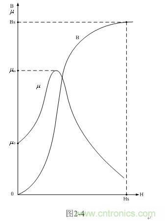 圖2-4是變壓器鐵芯導(dǎo)磁率和磁感應(yīng)強(qiáng)度對應(yīng)磁場強(qiáng)度變化的曲線圖。圖中,曲線B為磁感應(yīng)強(qiáng)度對應(yīng)磁場強(qiáng)度變化的關(guān)系曲線,曲線