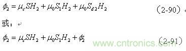 (2-91)式中,咋看起來(lái),變壓器初級(jí)線圈N1產(chǎn)生的磁通量 全部穿過(guò)變壓器次級(jí)線圈N2,它們之間應(yīng)該不存在漏磁通;但是,初級(jí)線圈在面積S1中產(chǎn)生的磁通 的方向與在面積Sd2中產(chǎn)生的磁通 的方向,正好互相相反;因此,變壓器初級(jí)線圈N1在面積Sd2中產(chǎn)生的磁通 ,仍然稱為變壓器初級(jí)線圈N1對(duì)變壓器次級(jí)線圈N2的漏磁通,其等效電感同樣稱為漏感。