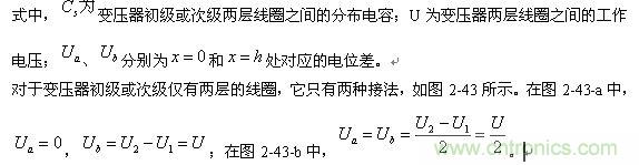 對于圖2-43-b,可求得變壓器初級或次級兩層線圈之間的分布電容為: