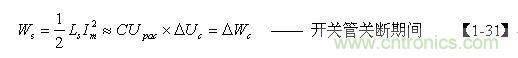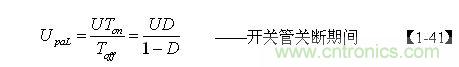 【1-41】式中,U為電源輸入電壓,Ton為電源開(kāi)關(guān)管的導(dǎo)通時(shí)間,Toff為電源開(kāi)關(guān)管的關(guān)斷時(shí)間,D為占空比。而Upau可根據(jù)漏感Ls 與開(kāi)關(guān)變壓器初級(jí)線圈的電感L的比值k求得。