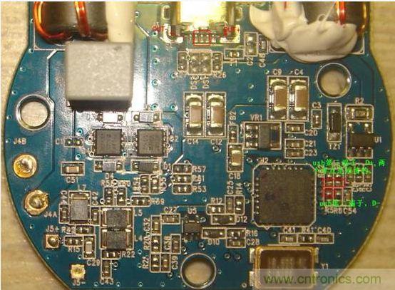 重點(diǎn)來(lái)了,點(diǎn)金石底部有三顆螺絲,撕掉那層膠墊就能看到。拆掉螺絲后,用硬物從插充電線的那個(gè)四方口可以很輕松的把底蓋撬開。然后是電路板,在micro接口那端是用膠水將電路板粘在下面的金屬塊上的,還是老辦法,用吹風(fēng)機(jī)吹熱,然后小心翹下來(lái)。要注意的是,翹電路板的時(shí)候注意別弄斷角落上兩根頭發(fā)絲那么細(xì)的線圈。其實(shí)為保險(xiǎn)起見,還如不先用烙鐵把這兩根線焊下來(lái)再拆電路板。電路板拆開可以看到一塊金屬,上面若干螺絲,拆吧。拆出金屬塊,你會(huì)發(fā)現(xiàn)金屬塊的背面粘了一塊形狀挺藝術(shù)的磁塊,用刀片切斷膠就可以弄下來(lái)了。