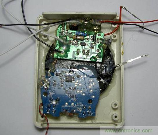 在這里我還在上蓋上鉆了兩個(gè)小孔制作了指示燈。我找了一直圓珠筆,筆桿是那種硬硬的透明的PE材料,我用電磨磨出剛好穿過小孔的細(xì)條,用打火機(jī)小心彎曲,把細(xì)條的另一端貼住電路板上的LED,將指示燈的燈光引到上蓋外面。然后用油料(橡皮泥)或者電工膠布包住led和細(xì)條,防止燈光干擾。最后用指甲銼將上蓋外突出來(lái)的筆桿銼平,用木片拋光,一切都很完美??上е谱鞯倪^程忘記照相了,還好下文可以看到做好的效果。
