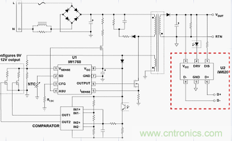 圖8 為基于Dialog 公司2014年初推出的iw620+iw1760的快速充電設(shè)計(jì)方案實(shí)物圖,電路的設(shè)計(jì)思路為iW620快速充電接口IC可以通過USB數(shù)據(jù)線檢測到支持Quick Charge 2.0的移動(dòng)設(shè)備發(fā)出的指令,然后與iW1760 PWM原邊控制器進(jìn)行通信,對電源適配器輸出電壓進(jìn)行配置。位于初級側(cè)的iW1760就可提供電流感應(yīng)。通過其可編程的主動(dòng)快速放電專利技術(shù)能將輸出電壓從9V或12V降至5V, 因此,當(dāng)用 戶拔掉連接Quick Charge 2.0手機(jī)的USB數(shù)據(jù)線,再將其連接至非Quick Charge 2.0手機(jī)時(shí),iW620可以迅速把輸出電壓降至5V,避免對其造成損壞。