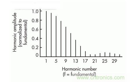 非線性負載可使諧波大小與線路頻率下的基本諧波電流具有可比性。圖4顯示了相對于線路頻率下的基本諧波大小進行標準化的高階諧波電流大小。不過,只有圖1中給出的在與線路頻率相同的頻率下且與電源線電壓同相的諧波電流(在此案例中為線路頻率下的基本諧波)對提供給負載的平均功率起作用。這些諧波電流會影響同一電力線上的其他設(shè)備的工作情況。