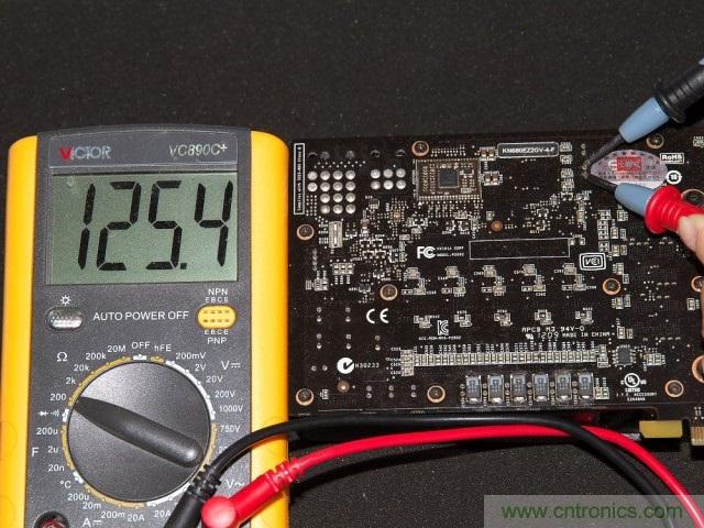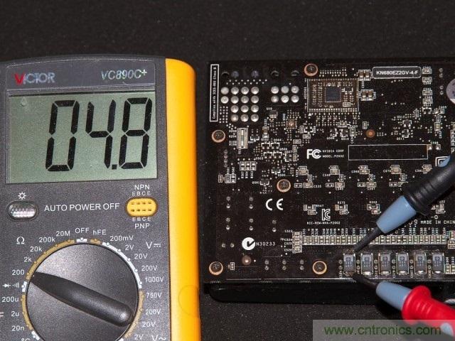 焊接完成后一是要用放大鏡配合電路圖仔細的測量各個元器件之間的連接關系,確定有無短路和虛焊。另外一個簡單的辦法就是通過直接測量供電回路的電阻值(關機狀態(tài)下)來確定是否有明顯的焊接失誤。通常來說GPU核心供電回路的電阻值在1歐姆到10幾歐姆之間,而顯存供電回路則是100-140歐姆左右。至于測量點,選擇核心和顯存供電模塊輸出電容的兩個引腳就可以了。可以看到改造前后核心、顯存供電回路的電阻值都在4.8歐/125歐左右,因此焊接是沒有問題的。