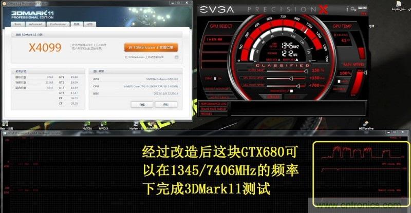 同時,改造以后在原裝散熱器條件下,可以以1345MHz的核心頻率完成3D Mark11測試,取得x4099的高分。而在改造之前雖然也能用1345MHz跑完測試,不過跑的不是特別順利,得跑幾次才能過一次。這應該是通過改造降低了供電紋波電流的功勞,可惜手邊沒有示波器,要不就能量化一下改造的效果了。