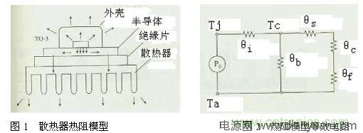 散熱器是開關(guān)電源的重要部件,它的散熱效率高與低關(guān)系到開關(guān)電源的工作性能,散熱器通常采用銅或鋁,雖然銅的熱導(dǎo)率比鋁高2倍但其價格比鋁高得多,故目前采用鋁材料的情況較為普遍,通常來講散熱器的表面積越大散熱效果越好,散熱器的熱阻模型及等效電路如圖1所示。
