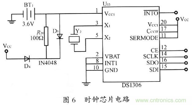 采用功能齊全的時(shí)鐘芯片DS1306。DS1306的時(shí)間、日歷和報(bào)警器可以通過(guò)寫(xiě)相應(yīng)的寄存器位來(lái)設(shè)置和初始化。通過(guò)讀相應(yīng)寄存器就可獲得日歷和時(shí)間。DSl306的電源供給有三種運(yùn)行方式,本系統(tǒng)采用可充電電池的方式,如圖6所示。