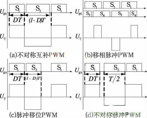 下面我們來(lái)具體說(shuō)一下控制型軟開(kāi)關(guān)PWM控制策略,它是指控制型軟開(kāi)關(guān)半橋DC/DC變換器不增加主電路元器件(可增加電感電容元件以實(shí)現(xiàn)軟開(kāi)關(guān)條件),通過(guò)合理設(shè)計(jì)控制電路來(lái)實(shí)現(xiàn)軟開(kāi)關(guān)。圖2給出4種控制型軟開(kāi)關(guān)半橋DC/DC變換器的PWM控制策略。