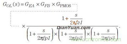 線性電源的等效模型模型如圖1所示, 穩(wěn)定直接如圖可知,電路的三個極點和一個零點,即得到開環(huán)傳遞函數Gop,GEA是誤差放大器的增益,GFB是反饋環(huán)路的增益,GPMOG是PMOS的增益。
