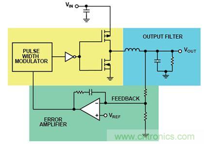 將典型開關(guān)電源輸出電壓(圖1)與內(nèi)部基準(zhǔn)電壓進(jìn)行比較,可看到差別集中在脈寬調(diào)制器(PWM)。PWM將斜坡與放大器輸出進(jìn)行比較,生成PWM信號(hào)來控制開關(guān),從而向負(fù)載供電。