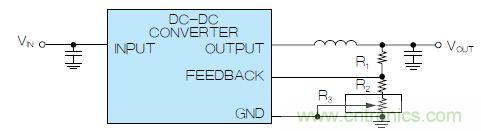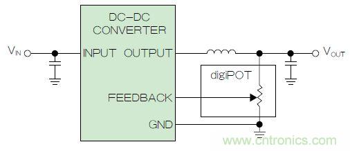 圖2. 使用數(shù)字電位計(jì)調(diào)整DC-DC轉(zhuǎn)換器輸出電壓,組成可變反饋電阻
