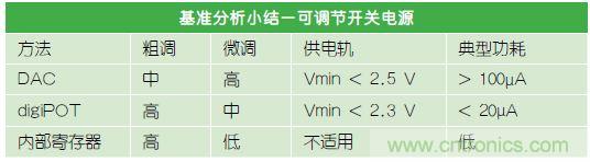 控制誤差放大器引腳電壓,便可調(diào)整輸出電壓。這可以通過使用DAC,或者使用數(shù)字電位計(jì),以外部方式實(shí)現(xiàn),如圖2所示。某些電壓調(diào)節(jié)器允許使用串行接口(比如PMBus、I2C或SPI)在內(nèi)部控制反饋電壓。表1比較了三種方法的調(diào)整能力和功耗。
