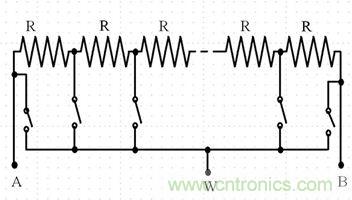 圖3:顯示電子開關(guān)的64位數(shù)字電位計(jì)。同一時(shí)間只能閉合一個(gè)電子開關(guān),該開關(guān)決定電阻比。