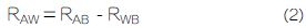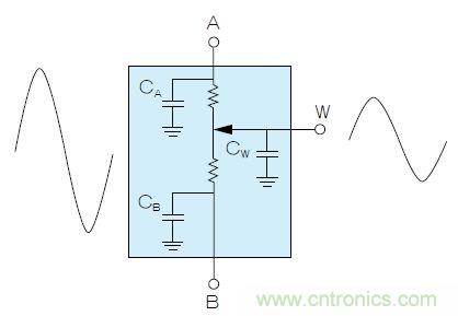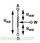 以數(shù)字電位計(jì)代替R1和R2時(shí),需考慮一些問題。數(shù)字電位計(jì)內(nèi)部有兩個(gè)電阻串(RAW和RWB),如圖4所示。