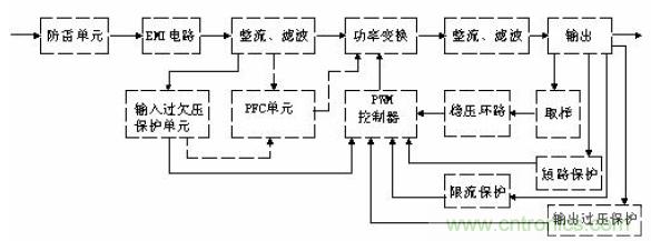 開關(guān)電源的主要電路是由輸入電磁干擾濾波器(EMI)、整流濾波電路、功率變換電路、PWM控制器電路、輸出整流濾波電路組成。輔助電路有輸入過欠壓保護(hù)電路、輸出過欠壓保護(hù)電路、輸出過流保護(hù)電路、輸出短路保護(hù)電路等。開關(guān)電源的電路組成方框圖如下:
