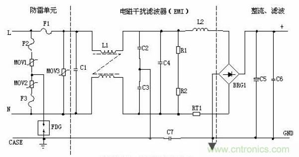 ② 輸入濾波電路:C1、L1、C2、C3組成的雙π型濾波網(wǎng)絡(luò)主要是對輸入電源的電磁噪聲及雜波信號進(jìn)行抑制,防止對電源干擾,同時(shí)也防止電源本身產(chǎn)生的高頻雜波對電網(wǎng)干擾。當(dāng)電源開啟瞬間,要對C5充電,由于瞬間電流大,加RT1(熱敏電阻)就能有效的防止浪涌電流。因瞬時(shí)能量全消耗在RT1電阻上,一定時(shí)間后溫度升高后RT1阻值減?。≧T1是負(fù)溫系數(shù)元件),這時(shí)它消耗的能量非常小,后級電路可正常工作。