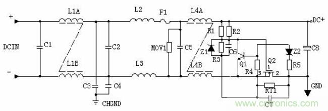 ② R1、R2、R3、Z1、C6、Q1、Z2、R4、R5、Q2、RT1、C7組成抗浪涌電路。在起機(jī)的瞬間,由于C6的存在Q2不導(dǎo)通,電流經(jīng)RT1構(gòu)成回路。當(dāng)C6上的電壓充至Z1的穩(wěn)壓值時(shí)Q2導(dǎo)通。如果C8漏電或后級電路短路現(xiàn)象,在起機(jī)的瞬間電流在RT1上產(chǎn)生的壓降增大,Q1導(dǎo)通使Q2沒有柵極電壓不導(dǎo)通,RT1將會(huì)在很短的時(shí)間燒毀,以保護(hù)后級電路。
