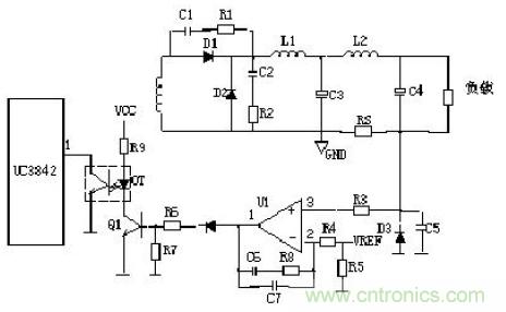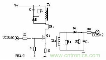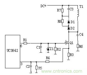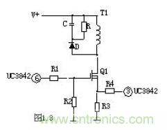 R4、C3、R5、R6、C4、D1、D2組成緩沖器,和開關(guān)MOS管并接,使開關(guān)管電壓應(yīng)力減少,EMI減少,不發(fā)生二次擊穿。在開關(guān)管Q1關(guān)斷時(shí),變壓器的原邊線圈易產(chǎn)生尖峰電壓和尖峰電流,這些元件組合一起,能很好地吸收尖峰電壓和電流。從R3測得的電流峰值信號參與當(dāng)前工作周波的占空比控制,因此是當(dāng)前工作周波的電流限制。當(dāng)R5上的電壓達(dá)到1V時(shí),UC3842停止工作,開關(guān)管Q1立即關(guān)斷。